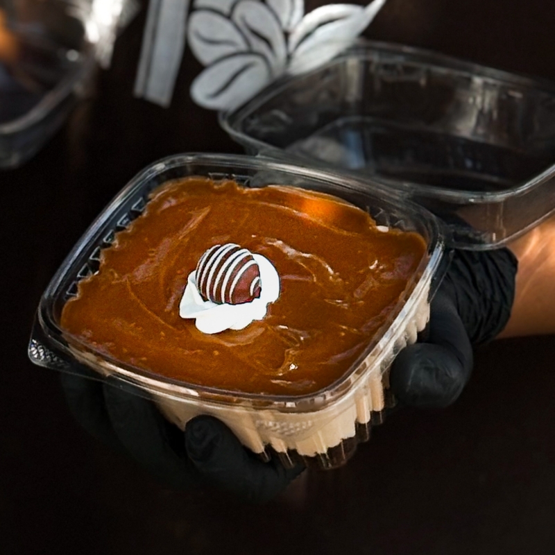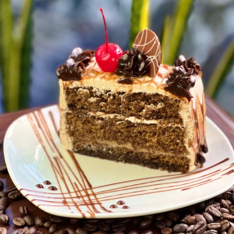Cremoso mousse de queso aromatizado y saborizado con extracto de café, con una base de keke de chocolate y bañando con una salsa de dulce de leche y café.