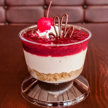 Base tradicional de galleta crocante, rellena de una suave y cremosa crema a base de fresa ,cubierta con una salsa de fresa artesanal