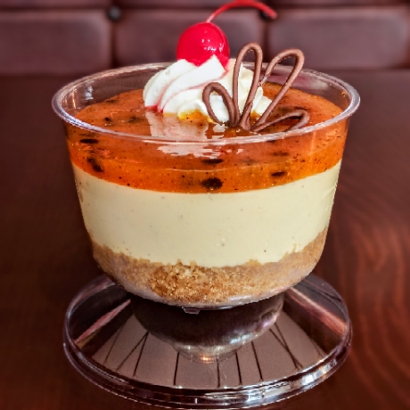 Tradicional base de galleta crocante, rellena de una dulce y ácida crema a base de maracuyá, cubierta de una salsa de maracuyá artesanal