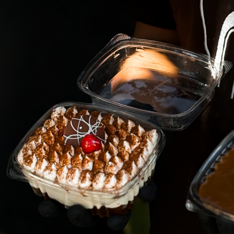 Postre con una base de bizcocho humedecido en un almíbar de café aromatizado con ron y acompañado de una sedosa capa de crema de queso decorado con cacao semi amargo.